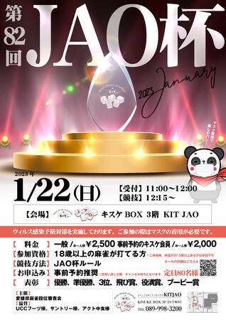 2023年1月22日(日)、キスケ株式会社(本社:愛媛県松山市、代表取締役社長:山路義則)が運営するマインドスポーツスタジアム「キスケ 麻雀KIT JAO」(キットジャオ)において、『第82回JAO杯』が開催されます。22年の歴史がある『JAO杯』は、18歳からシニアまでの県内外の麻雀愛好家が参加する四国最大の健康マージャン大会です。