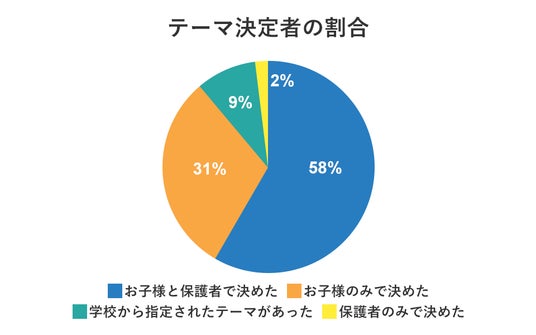 自由研究への保護者の関与度についてアンケートを行ったところ、71%の保護者が子どもの自由研究を手伝っていることが分かりました。テーマ決めについても、58%の家庭が親子で一緒にテーマを決めているようです。