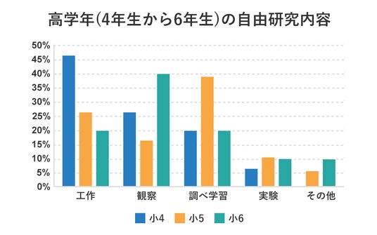高学年(4年生から6年生)の自由研究では、「工作」が最も人気がありました。高学年は低学年と違って3学年とも人気なテーマが異なっており、4年生は「工作」、5年生は「調べ学習)」、6年生は「観察」がそれぞれ人気でした。