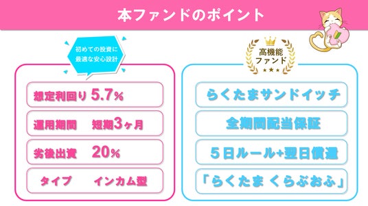 本ファンドへの投資額は「らくたま くらぶおふ」(シーズン2=2025年3月1日から3ヶ月)の参加基準となる2月15日時点の運用金額に合算されます。魅力的な特典が満載の「らくたま くらぶおふ」にぜひご参加ください。詳細はこちらのPDF資料「らくたまWORLD(新しい冒険をはじめよう!)」をご確認ください。