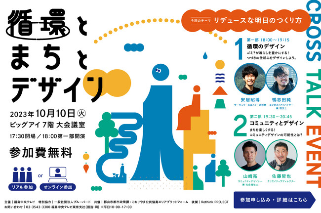 福島県郡山市が福島中央テレビと連携し開催するトークイベントで、今回のテーマは「リデュースな明日のつくり方」。参加者の皆さんと一緒に、暮らしているまちのことを楽しみながら考えたり、地域コミュニティを温めたり、地域課題から健やかなまちの環境を創造していきます。