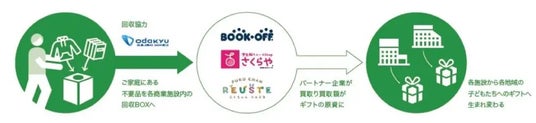 「マチチカ、ヒトチカ プロジェクト」第3弾『Re:born』では、小田急SCが運営する、東京都、神奈川県の9つの商業施設(※1)に「不用品回収ボックス」が設置され、「ふくちゃんリユスタ」はこども服を回収・査定します。前回に引き続き、ブックオフコーポレーション株式会社、学生服リユースshopさくらやとともに、有料参加型のチャリティイベントを開催。「中古おもちゃの詰め放題」や「はぎれを使ったワークショップ」、「ランドセル譲渡会」、「サイコロチャレンジ」などの催しを予定しています(※2)。「不用品回収ボックス」に集まった品物の査定額とイベントの収益は、「子育て応援」や「地域課題の解決」をテーマとしたギフトとなり、小田急SCより各施設が立地する自治体や公共施設(※3)に寄贈されます。