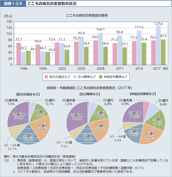 実際、厚生労働省が行った「こころの病気の患者数の状況」によると、統合失調症・気分障害・神経症性障害などを始めとするこころの病気の患者数が年々増加傾向であることが報告されています。