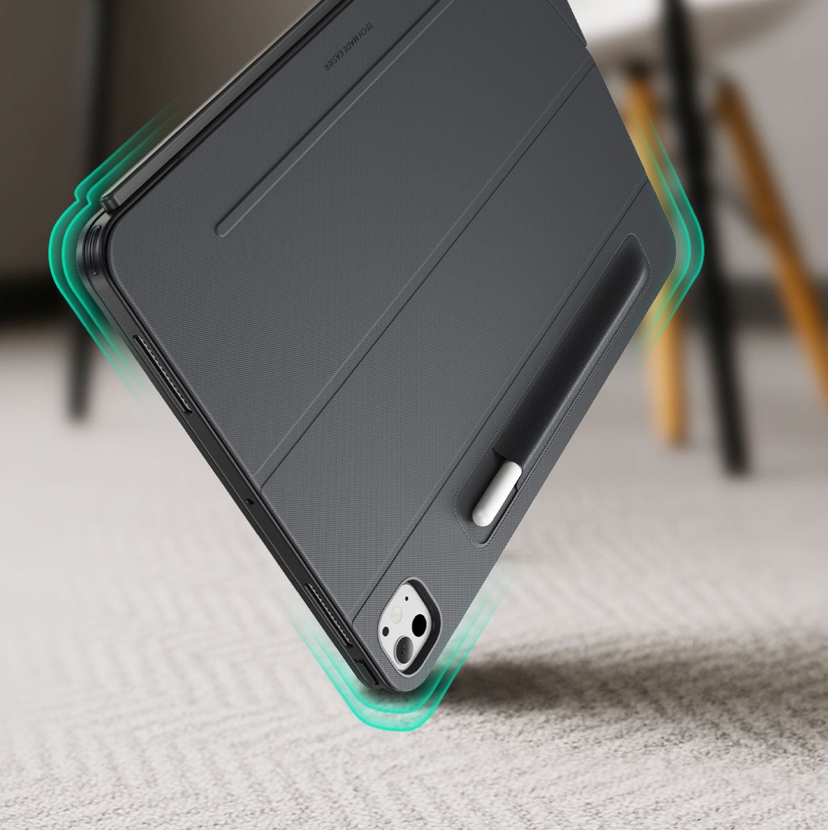 一般的なキーボードケースより約20%軽量化させた製品総重量は約560~735gの「ESR Shift キーボードケース(脱着式)」は、落下時の衝撃を吸収するエアガードコーナーを備え、持ち運びや日常使用からの衝撃及びスクラッチからデバイスを守ります。