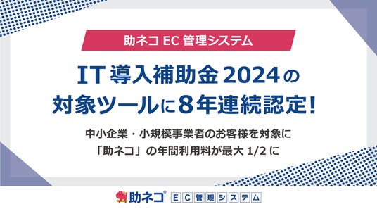 株式会社アクアリーフ(本社:神奈川県平塚市、代表取締役 長谷川 智史)が提供するネットショップ向け業務管理システム「助ネコ(R)EC管理システム(以下、助ネコ)」が、経済産業省が推進する「令和5年度補正サービス等生産性向上IT導入支援事業(以下、IT導入補助金2024)」の対象ツールに8年連続(2016年~2024年)で認定されました。