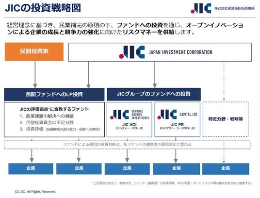 JIC は2018 年 9 月、産業競争力強化法に基づき発足した投資会社です。JICは、国内投資・イノベーションの好循環の創出、スタートアップの創出・育成、大学発スタートアップ・中堅企業等による地方に眠る経営資源の活用、市場・ビジネス環境の変化に対応する事業再編の促進、を重点投資分野としています。これらの分野に対し、傘下のファンドや民間ファンドへの LP 投資を通じてリスクマネーを供給することで、我が国におけるオープンイノベーションを推進し、我が国産業の競争力強化や投資エコシステムの拡大に貢献することを目指しています。