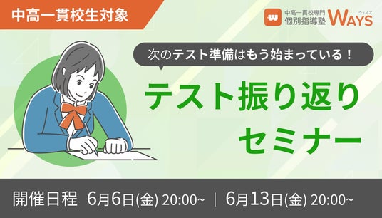 株式会社メイツ(本社:東京都新宿区 代表取締役:遠藤尚範)が運営する『中高一貫校専門 個別指導塾WAYS(以下、WAYS)』では、毎回のテスト結果に一喜一憂してしまい、復習をおろそかにしがちな生徒様およびその保護者様向けに、期末テストに向けた定期テスト振り返りセミナーを2週連続で開催いたします。
