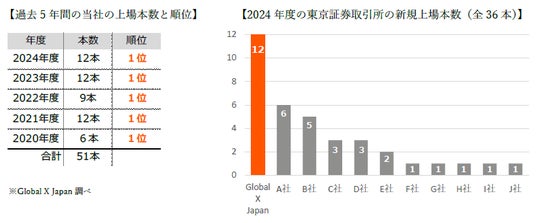 大和証券グループのGlobal X Japan株式会社(東京都千代田区、代表取締役社長 藤岡 智男。以下「当社」)は、このたび東京証券取引所への新規上場本数が5年度連続で1位となったことをお知らせします。