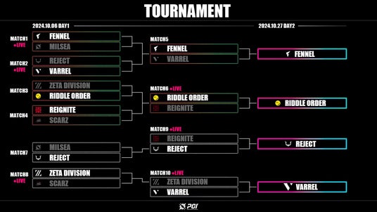 今回のPCIセカンドステージDAY1では国内の8つの強豪チームがGSL形式で競うトーナメントとなっており、FENNEL,REJECT,RIDDLE,VARRELの4チームが各トーナメントの激戦を勝ち抜き、セカンドステージDAY2(シングルエリミネーショントーナメント形式,BO5)への切符を手にしました。