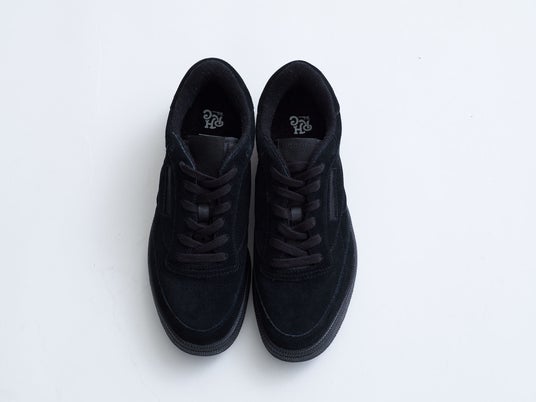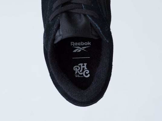 本作は80年代のクラシックなテニスデザインをヒントに、シンプルな美しさを追求したReebok(リーボック)のアイコンプロダクトの一つ、「CLUB C 85 VINTAGE」をベースに別注しました。アッパーに配されていたブランドロゴを無くし、品のあるスウェードレザーを採用。カラーをオールブラックにすることで、RHCらしいよりシンプルでモダンな印象に仕上げました。スポーティーでカジュアルな装いにはもちろん、モード感のあるスタイリングにもマッチし、コーディネートの幅を広げます。また、インソールにはリーボックとのダブルネームが施されたスペシャルピースです。