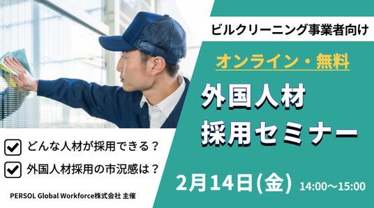 パーソルグループで外国人材に特化した人材サービスを提供するPERSOL Global Workforce(パーソル グローバルワークフォース)株式会社(本社:東京都港区、代表取締役社長:多田 盛弘)は、2025年2月14日(金)に、特定技能・ビルクリーニング分野の外国人材採用の無料オンラインセミナーを開催します。最近の外国人材採用市場の市況感から、具体的な採用フローなどを詳しくお伝えします。