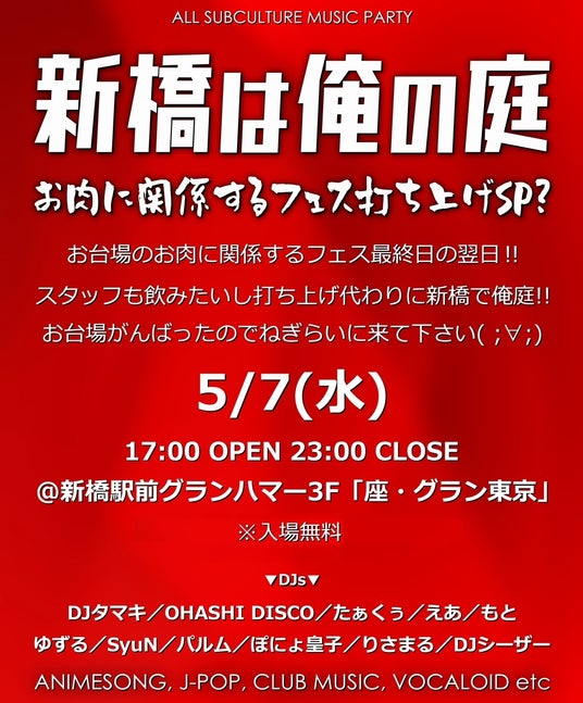 4/16(水)夜に初回が開催され、平日にも関わらずいきなり100人以上を動員した人気アニソン系DJイベント「#俺庭」が、5/7(水)に開催決定!