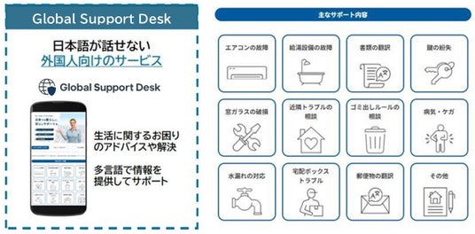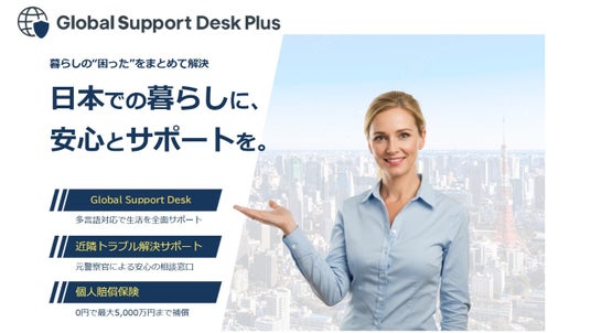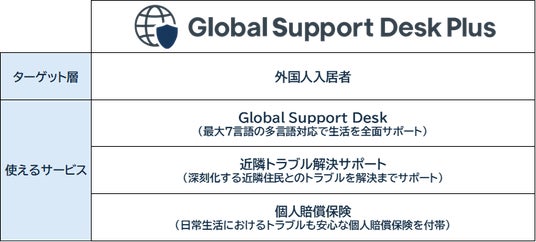 当社はこの社会課題のソリューションとして、2024年1月より外国人入居者に向けて母国語でライフラインの手続きや、新生活支援で培った知見を活かし、「Global Support Desk(グローバルサポートデスク)」を開発しました。そしてこのたび、「Global Support Desk」と近隣トラブル解決サポートと個人賠償保険を組み合わせ、より包括的な支援体制へと進化させたサブスクリプションサービス「Global Support Desk Plus(以下、本サービス)」の提供を開始します。