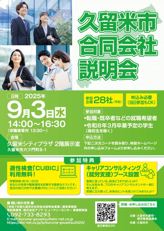 久留米市雇用・就労推進協議会が主催する本イベントは令和8年3月卒業予定の学生や一般求職者を対象に、久留米市内企業が直接会社説明を行い、久留米市への就職を促進することを目的としています。