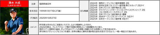 本契約により、各選手は今シーズン、当社ブランド「カープレミア」等のロゴが入ったキャップやウェアを使用して国内外のツアートーナメントに出場いたします。
