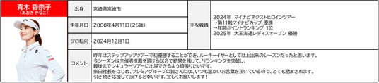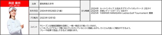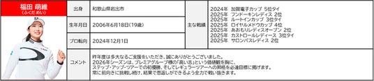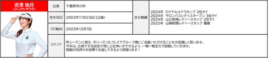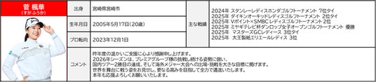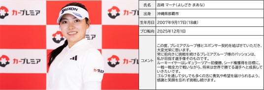 2026年シーズンは、2025年末にプロ転向したばかりの沖縄県出身、吉崎マーナ選手を新たに迎えました。ルーキーイヤーから世界を見据え、一戦一戦に全力で挑む彼女の姿勢は、当社の次世代支援を象徴する新たな力となります。あわせて、国内外のツアーで果敢な挑戦を続け、多くのファンを魅了する実力派のプロゴルファー6名ともスポンサー契約を更新いたしました。