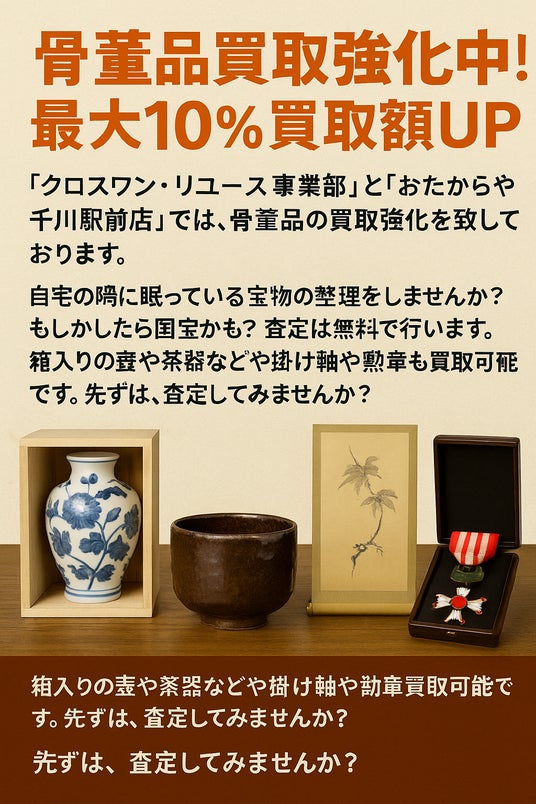 株式会社クロスワン(本社:東京都豊島区、代表取締役:品川あきら)が運営する「クロスワン・リユース事業部」および「おたからや千川駅前店」では、2025年7月5日(土)から7月31日(木)までの期間、骨董品買取額が最大10%アップするキャンペーンを実施中です。