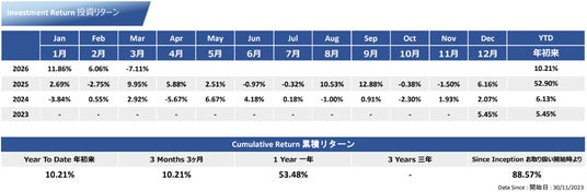 2026年3月度のリターンは-7.11%でした。これにより手数料差し引き前の累積リターンは直近1年が53.48%、積立開始からは88.57%となりました。