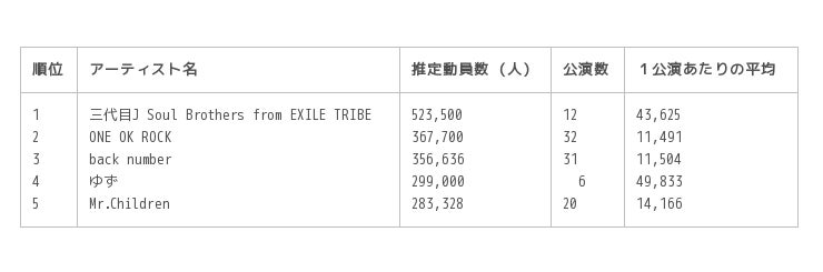 4位と5位には、自身最大規模の全国アリーナツアーを開催したONE OK ROCK、back numberがそれぞれランクインしました。