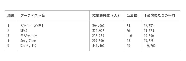 総合部門では、昨年から続いている自身2度目のドームツアーを行った三代目J Soul Brothers from EXILE TRIBEが獲得。2位は、ツアー冒頭から横浜アリーナで5日連続9公演というハードな日程にありながらも、約4ヶ月にわたって全国を駆け抜けたジャニーズWESTでした。