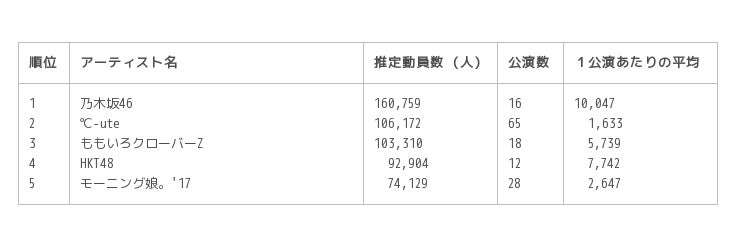 ライブファンズ株式会社が運営する音楽ライブ情報サービス「LiveFans(http://www.livefans.jp)」は、2017年上半期 推定観客動員ランキング(※1)および、メーカー別ライブ動員シェア(※2)を発表しました。本ランキングは、ライブファンズの独自調査・集計によるものです。