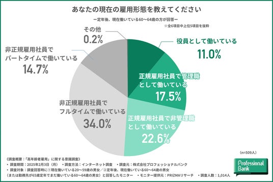 今回の調査に回答いただいた、定年後(または勤務先が65歳定年)も働いている60~64歳のシニア世代の現在の雇用形態は以下の通りです。