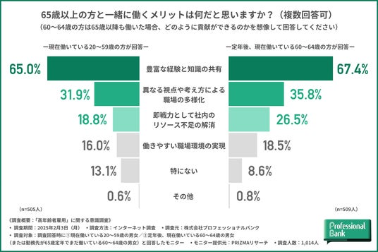 65歳以上の方と働くメリットは「豊富な経験や知識の共有」が圧倒的多数で、現役世代とシニア世代で共通している