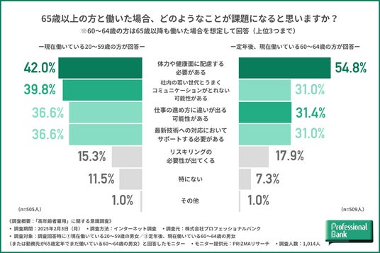 株式会社プロフェッショナルバンク(本社:東京都千代田区、代表取締役社長:呑田 好和)のHR研究所は、2025年4月【高年齢者雇用安定法の改正】を前に、1.現在働いている20~59歳の男女/2.定年後(または勤務先が65歳定年)も働いている60~64歳の男女を対象に、「高年齢者雇用」に関する意識調査を実施しました(有効回答数:1,014人)。