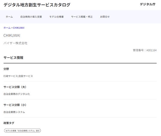 全国の自治体へ情報発信ソリューションを提供するバイザー株式会社(本社:愛知県名古屋市、代表取締役:中島 秀典)は、同社が提供する自治会・町内会運営支援システム「CHIKUWA!」が、デジタル庁の「デジタル地方創生サービスカタログ」において、「自治会業務システム」のモデル仕様書に適合するサービスとして掲載されたことをお知らせいたします。