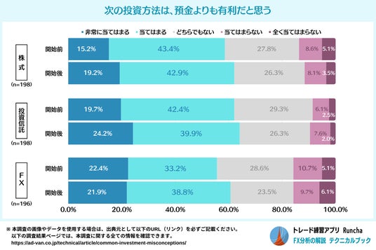 開始前における「預金よりも有利」と考える人の割合は、株式が58.6%、投資信託が62.1%、FXが55.6%でした。一方、「預金よりも不利」と考える人の割合は、株式が13.6%、投資信託が8.6%、FXが15.8%でした。