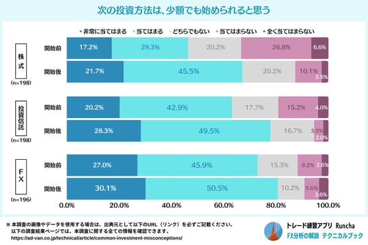 いずれの投資方法でも、開始前よりも開始後の方が、「少額で始められる」と考える人が増加し、「少額では始められない」と考える人が減少しています。