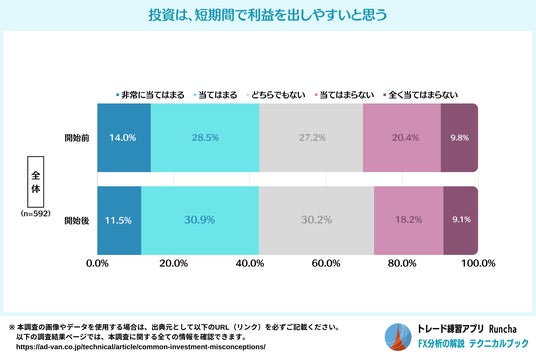 「非常に当てはまる/当てはまる(=短期間で利益を出しやすい)」と回答した人は、開始前は42.6%、開始後は42.4%とほぼ同水準でした。また、「当てはまらない/全く当てはまらない(=利益を出すには時間がかかる)」と回答した人は、開始前は30.2%、開始後は27.4%とわずかに減少しています。