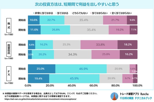 開始前における「短期間で利益を出しやすい」と考える人の割合は、株式が33.3%、投資信託が22.7%、FXが71.9%でした。一方、「利益を出すには時間がかかる」と考える人の割合は、株式が31.3%、投資信託が52.0%、FXが7.1%でした。