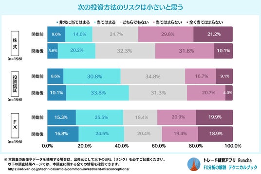 開始前における「リスクは小さい」と考える人の割合は、株式が24.2%、投資信託が39.4%、FXが40.8%でした。一方、「リスクが大きい」と考える人の割合は、株式が51.0%、投資信託が25.8%、FXが40.8%でした。
