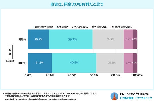 「非常に当てはまる/当てはまる(=預金よりも有利)」と回答した人は、開始前は58.8%、開始後は62.3%と3.5%増加しました。このうち「非常に当てはまる(=預金よりも非常に有利)」と回答した人は、開始前の19.1%に対して開始後は21.8%と2.7%の増加となっています。