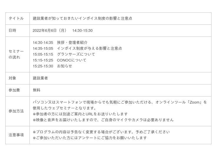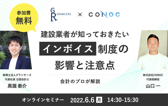 株式会社CONOC(本社:東京都渋谷区、代表取締役:山口一、以下CONOC)は、税理士法人グランサーズ(本社:東京都渋谷区、代表:黒瀧泰介、以下グランサーズ)と共催で、2022年6月6日(月)に無料オンラインセミナー「建設業者が知っておきたいインボイス制度の影響と注意点」を開催いたします。