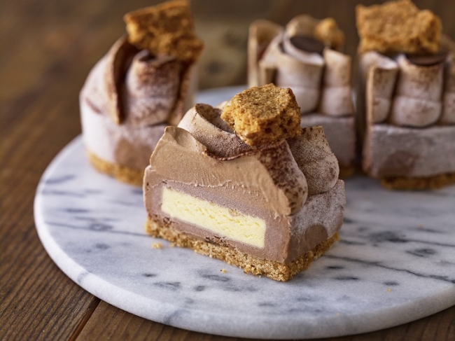 北海道バターたっぷりのサブレ・ブルトンヌに、フランス、ヴァローナ社のチョコレート「アラグアニ」を贅沢に使用したチョコレートをのせて、キャラメル&チョコレートアイスでデコレーション。中心にしのばせたバニラアイスも絶妙な、王道の組み合わせです。