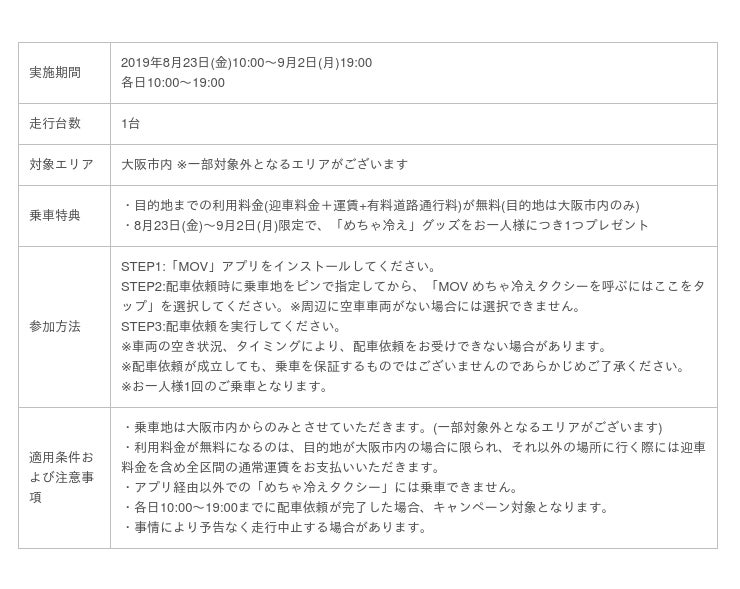 株式会社ディー・エヌ・エー(本社:東京都渋谷区、代表取締役社長兼CEO:守安 功、以下DeNA)が提供する、次世代タクシー配車アプリ「MOV(モブ)」は、夏場に涼しく移動したいというニーズにお応えし、「大阪・京都の暑い夏を乗り切ろう ~MOV今なら冷えてます~」キャンペーンとして、車内で冷涼体験ができる「めちゃ冷えタクシー(協力:近鉄タクシー株式会社)」を、2019年8月23日(金)から9月2日(月)まで期間限定で、大阪市内の対象エリアで無料運行します。