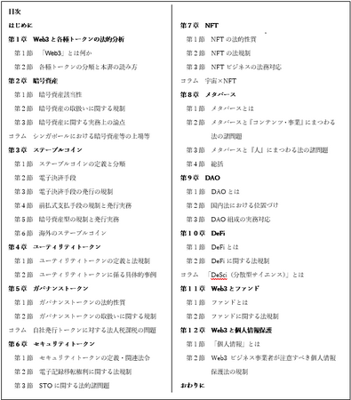 本書は、弊所内の各産業別チームにおける実務対応の知見を基にWeb3ビジネスの構成要素ごとにその法的性質や業規制及び実務上の問題点を解説したWeb3ビジネスの法務についての体系書です。変化の激しいWeb3ビジネスに関して最新の法改正情報や議論等を可能な限り反映をしました。Web3ビジネスに携わる事業者やその法務担当者の方又はそれらを外部から支援する弁護士などの法律専門職の方にとって、Web3ビジネスを法務の面から推進するための一助としていただければ幸いです。
