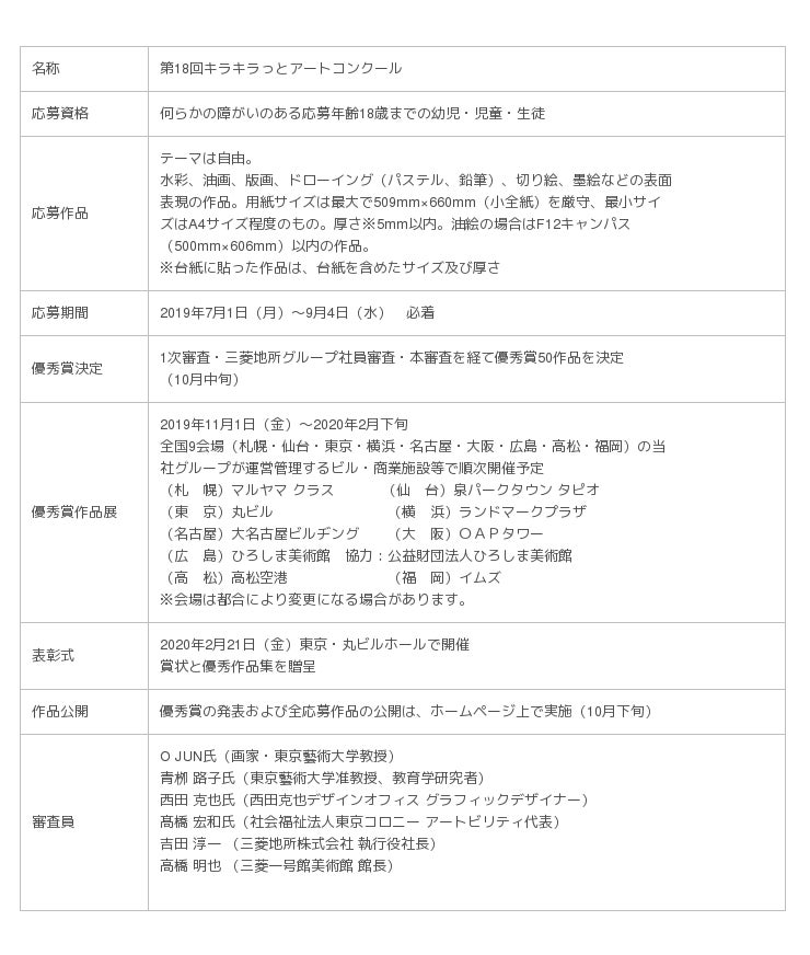三菱地所が開催する「キラキラっとアートコンクール」は、障がいのある子どもたちの可能性を応援したいとの想いから、国内初の障がい者アートライブラリー アートビリティ※を運営する社会福祉法人東京コロニーの協力を得て、2002年にスタート。アートビリティの登録作家として現在25名が活躍するなど、子どもたちの才能を支援してまいりました。