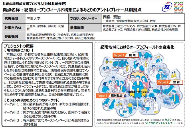 紀南地域は三重県南部に位置し、世界遺産に登録された熊野古道をはじめ、美しい自然環境と文化遺産で知られる場所です。この魅力あふれる紀南地域に多様な若者が先進技術を学びに集い、地域と協力しながら新たな農村社会や地域の魅力を再形成するプロジェクトです。「紀南オープンフィールド構想」では、地域、大学、企業が一体となって、新たな価値を創出し、地域社会の発展と革新を目指します。