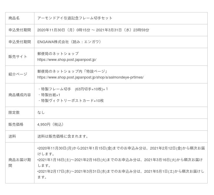 ENGAWA株式会社(東京都新宿区 代表取締役社長 牛山隆信)は、 2020年11月30日0:15より「郵便局のネットショップ」にて、 「アーモンドアイ引退記念純金プレートセット」 、「アーモンドアイ引退記念フレーム切手セット」の販売を開始いたします。