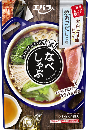 「なべしゃぶ 焼あごだしつゆ」は、焼あごだしと太白ごま油をバランスよくあわせ、しゃぶしゃぶでも定番の和風だしの上品な風味やうまみを表現しました。豚肉と冷蔵庫にある身近な野菜でしゃぶしゃぶを楽しむことができ、〆(しめ)にはラーメンとの相性が抜群です。