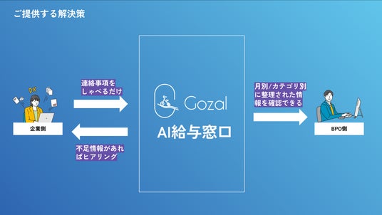 株式会社Gozal(本社:東京都目黒区、代表取締役:高谷 元悠)は、生成 AI/大規模言語モデル(LLM)を活用し、給与連絡事項の整理を自動化するクラウドサービス 「AI給与窓口」 をリリースしました。「AI給与窓口」 は、社労士やBPOベンダーの顧客が “話すだけ” で給与連絡を完結できるクラウドサービスです。音声/テキスト入力/画像ファイル添付など、多様な手段での連絡を、AIが理解し、不足情報があれば自動でヒアリング。得られた情報は 月別・カテゴリ別 に整理され、給与に影響を与える重要な連絡票として即座に社労士/BPOベンダーに共有されます。