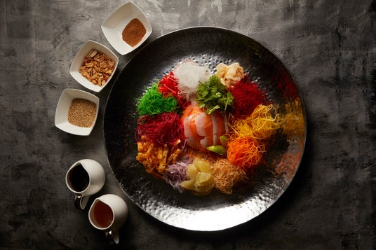 2024年の旧正月は2月10日。「ローヘイ(撈起)」という掛け声とともに、商売繁盛、健康長寿、さまざまな願いを新しい1年に込めて、真鯛やサーモン、コリアンダー、玉ねぎ、にんじんなど色とりどりの具と、ピーナッツ、中華料理に欠かせないスパイス五香粉や広東風甘みその海鮮醤油が混ざる東南アジアのエキゾチックな味をご堪能ください。