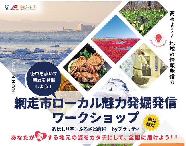 今回の開催も昨年に続き「ローカル魅力発掘発信プロジェクト」の一環として、網走市教育委員会が地域住民の生涯学習の一環として推進する「あばしり学」と連携し開催します。発掘された網走の魅力は、JTBのふるさと納税サイト「ふるぽ」で発信するとともに、返礼品の開発にもつなげます。