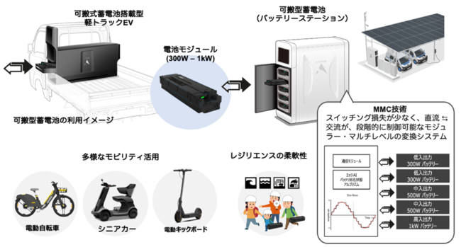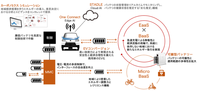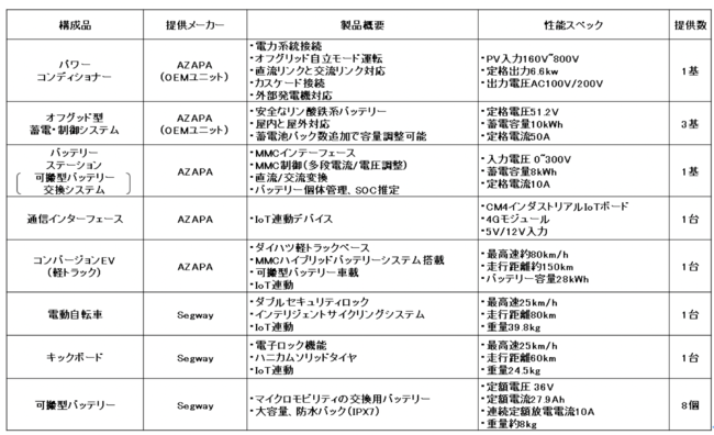 本実証事業は、電力系統から完全に分離・独立したソーラーカーポートと蓄電・制御システムを一体化した太陽光発電電力のみで運用するEVステーションにカーシェアリングサービスを組み合わせた取り組みで、AZAPAは、この取り組みに対し、パワーコンディショナーや蓄電・制御システムなどの基盤に加え、バッテリーステーション(可搬型バッテリー交換システム)、可搬式バッテリーで動くコンバージョンEV(OEMメーカーとの共創事業)およびモビリティを提供します。