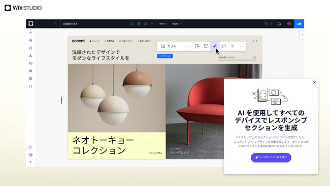 Wix Studio には、先日登場した AI 搭載の Web 制作向け機能群(https://ja.wix.com/blog/2023/08/avishai-abrahami-thoughts-about-ai)の一部に加えて、レスポンシブおよびコードの AI 機能が搭載されています。これらのツールは、複雑な Web デザインやコンテンツ制作のタスクを簡素化し、生産性を大幅に向上させるのに役立ちます。