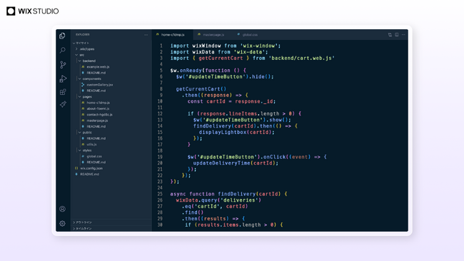 堅牢なコーディング環境:プロフェッショナルかつ Wix 独自の、VS Code をベースにしたオンライン統合開発環境(IDE)を使って、サイトにフロントエンドやバックエンドのコードを追加したり、Wix 製またはサードパーティ製の API とシームレスに連携したりすることができます。また、開発者は、サイトを GitHub に接続することで、好みの IDE を使って開発を行うことも可能です。
