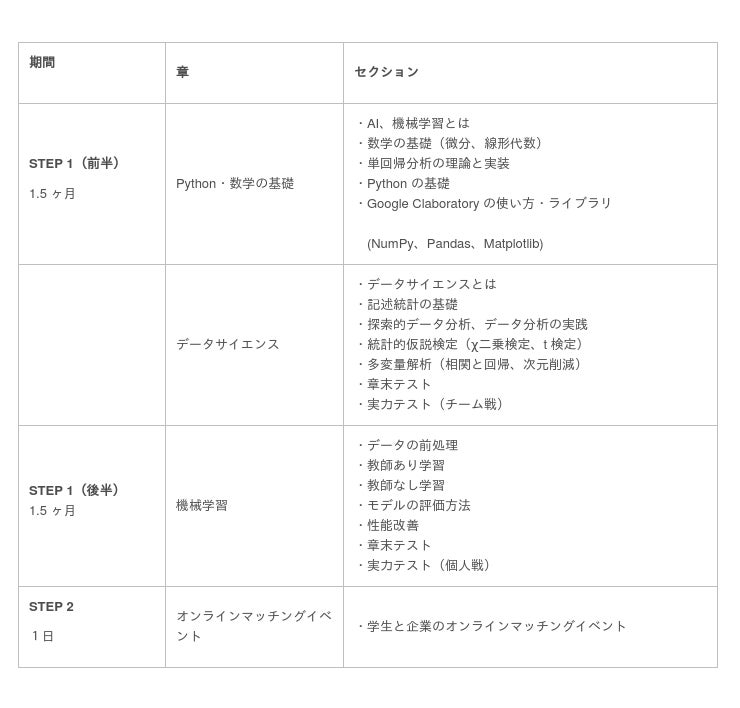 大学生がデータサイエンスや AI・機械学習など、専門スキルを習得できるよう、技術習得だけではなく、ビジネスの場での活用を想定した実践的なワークなどを取り入れた、3 か月間のオリジナルのカリキュラムを提供します。また、スキルを保持した学生を採用したい企業と学生とのマッチングイベントを開催し、育成から適切な職種・業界・企業選びまでをワンストップでサポートします。